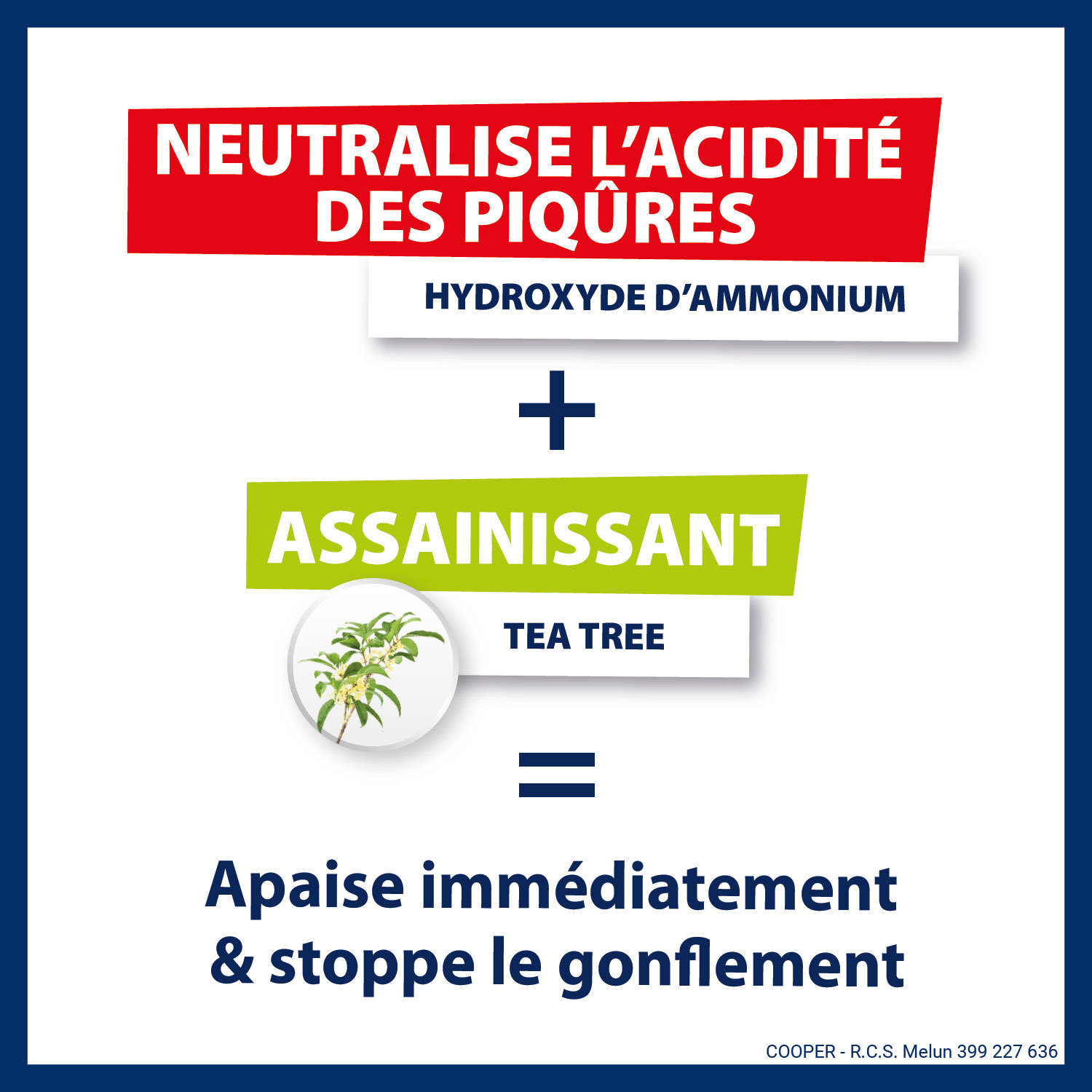 Hydroxyde d’ammnium : neutralise l’acidité des piqûres, Tea tree : assainissant